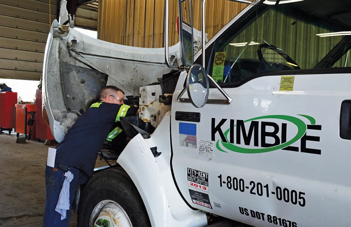 On any given day, trash and recycling services provider Kimble Cos., based in Dover, Ohio, has between 320 and 340 trucks out on the road out of its 350-unit fleet. Of those vehicles, 175 use compressed natural gas (CNG) to lower greenhouse gas emissions. Dan Dubel, corporate maintenance manager, says Kimble uses a mixture of roll-off, front-load, rear-load and side-load vehicles from Heil and Dodge Center, Minnesota-based McNeilus.