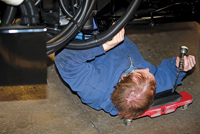 “Check the air system, the air intake, the emissions systems,” advises Dan Holdmeyer, North American industry sector manager, Chevron. “Examine the chassis—the torque and fasteners, transmission, differential…look for UV joint wear, wiring harness chafing. Inspect the hydraulic hoses. The visual inspection is very important.”