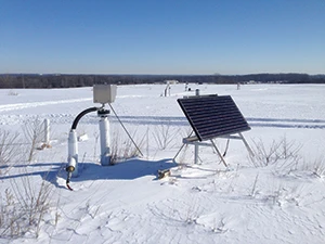 In addition to the day-to-day operation of the landfill gas extraction system (maintaining and operating the blower and flare units; measuring the applied pressure at the wellheads and adjusting the control valves accordingly to ensure the system is properly balanced; measuring flow rates of LFG; collecting and treating condensate; etc.), a crucial function is monitoring for LFG that could be migrating beyond the limits of the landfill. There are five broad categories of LFG monitoring: soil gas monitoring for LFG migrating through the soil; near surface gas monitoring for airborne LFG; emissions monitoring directly at the LFG vent or flare stack; ambient air monitoring for general outdoors LFG content; and indoor air monitoring for LFG that may have accumulated in confined spaces or buildings. Depending on what is being monitored, the sampling equipment can be handheld portable units or permanently installed sampling stations, and either consists of continuous monitoring or one-time measurements by grab samplings.