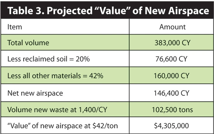 If we further assume that the landfill is reclaimed at an average cost of $4 per cubic yard, then the reclamation cost (383,000 yd³ x $4 per cubic yard) is equal to $1,532,000. Clearly, in this example, the reclamation benefit far outweighs the cost. If cover soil has to be purchased from an outside source, there could be another savings benefit by reusing the recovered soil. At higher tipping fees, the benefit gets even better.
