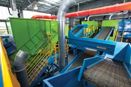 The complex has a metering drum on the infeed, a scalping screen, glass breakers, three CP newspaper screens, a three-deck old corrugated cardboard (OCC) screen, several three-deck ONP screens, and various glass breakers and air-drum separators. One of the HRB balers is dedicated to fibers, the other to bottles and cans. The MRF has one MSS Aladdin optical sorter used for polyethylene ester terephthalate (PETE) plastic.