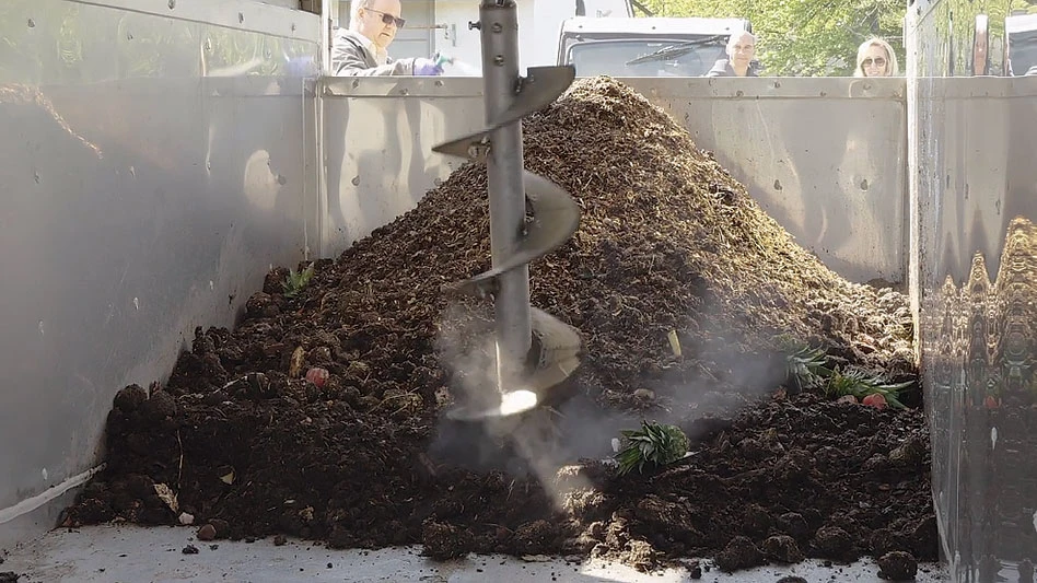 According to GMT, the Earth Flow composting system automatically mixes, grinds and aerates compostable materials in an enclosed vessel that is similar to a shipping container. The aeration system vents exhaust through a biofilter to eliminate odors while the system is operating.