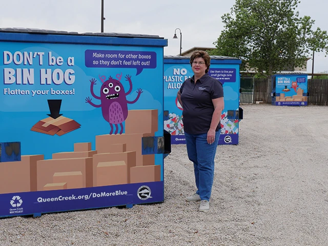 RAMONA SIMPSON IS proud of Queen Creek, AZ’s 8% recycling contamination rate. “We try to keep contamination rates down before the materials go to the MRF,” she says. Education is key to success, something of which Simpson is keenly aware as the director of SWANA’s Communication, Education & Marketing Technical Division. She also serves as Queen Creek’s Environmental Programs Manager. Her duties not only include directing solid waste, recycling, and hazardous waste programs, but she also oversees stormwater management, reclaimed water, and air quality—tasks which are essentially interconnected. A successful solid waste and recycling program entails clear communication that involves not only what to put into a cart, but what not to put into a cart—and options of disposal for those materials, Simpson notes. Even how to put materials in a cart is important, notes Simpson, adding that overfilling it creates the “snow cone” effect, enabling birds to peck open the plastic bags, creating litter on the street. Queen Creek’s bulk collection centers around the 3 Bs: bundled, boxed, or bagged. Auditing, education outreach, inspection, and enforcement are the program’s foundation. Inspection programs offer opportunities to place educational materials on a cart regarding overfilling and proper material disposal. Contamination can be dangerous, Simpson points out. “We had someone put the plastic bucket for their chlorine tablets in the recycling cart with aluminum cans. We had a hot load—a fire that happens within the confines of the recycling truck,” says Simpson. “I don’t think people are trying to contaminate. They want to do the right thing. They’re doing ‘wishful recycling.’” Queen Creek has take-back events throughout the year for harder-to-recycle materials. “Our community is only 50,000 residents and 13,000 homes with trash recycling services,” says Simpson. “We’re pretty small, but all of our events are highly attended.” The city also has an intergovernmental agreement with a bordering community to use its household hazardous waste facility. While some communities are closing neighborhood recycling centers, Queen Creek is “doubling down,” Simpson says.
