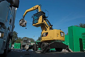 For material handling, Caterpillar offers a full line of small, medium, and large excavators for use in waste applications, says Griffith. “We also have wheeled excavator offerings that are more mobile in landfill and transfer station/MRF applications,” he adds. “All of these machines can be fitted with waste guarding, debris screens, cab filtration systems, reversing fans, and other components either by Caterpillar or OEMs. Depending on the type of application and its needs, there are several undercarriages, and boom/stick offerings.”
