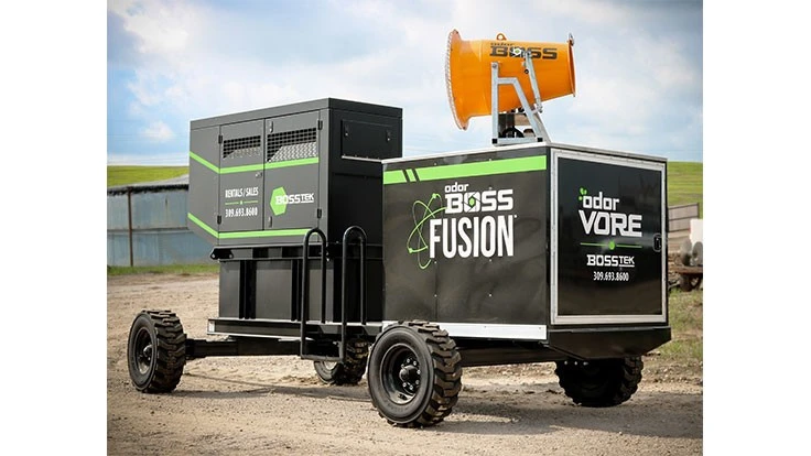 BossTek, a Peoria, Illinois-based company that focuses on industrial dust and odor control solutions, has developed a mobile system that uses no water to reduce site odors from soil remediation, landfill, food processing, composting, wastewater and other large-scale applications. OdorBoss Fusion has a patent-pending delivery system that eliminates the need for water dilution, the company says. The nozzle technology and ducted fan distribute the odor control chemicals over a wide area, and the unit can run for more than a week without operator intervention.