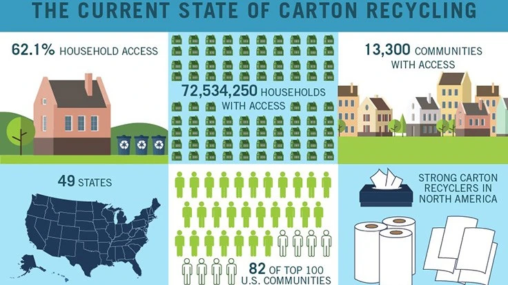The Carton Council of North America has reported that more than 62 percent of U.S. households can recycle food and beverage cartons through local recycling programs.