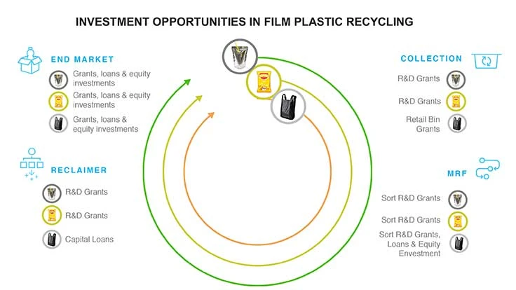 While retail collection remains a viable way to collect clean polyethylene film bags and wraps for recycling, it will struggle to reach scale, according to the study. Plus, recycling opportunities are needed for other flexible packaging materials. The study recognizes the crucial work of groups like Materials Recovery for the Future (MRFF), Dow Energy Bag and material recovery facility (MRF) equipment manufacturers that are testing ways to collect this material through the curbside residential recycling programs to ensure greater quantities of plastic film get recycled. “That is why this study was important—to identify where the investment community could make the most significant impact while avoiding duplication of efforts,” the Closed Loop Foundation says.