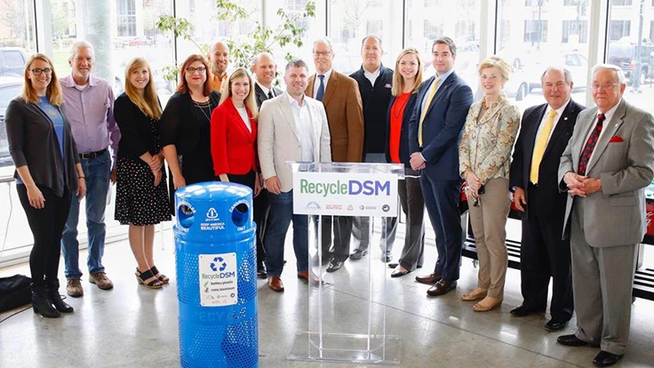Recycle DSM says it aims to create a “cleaner and greener” downtown Des Moines. The program began in October with eight receptacles in the Historic East Village and has expanded to 50 bins in April thanks to a grant from the Coca-Cola/Keep America Beautiful Recycling Bin Grant Program. The program awarded a grant for recycling bins to Operation Downtown, with the city of Des Moines Public Works Department also providing additional investment to expand Recycle DSM.