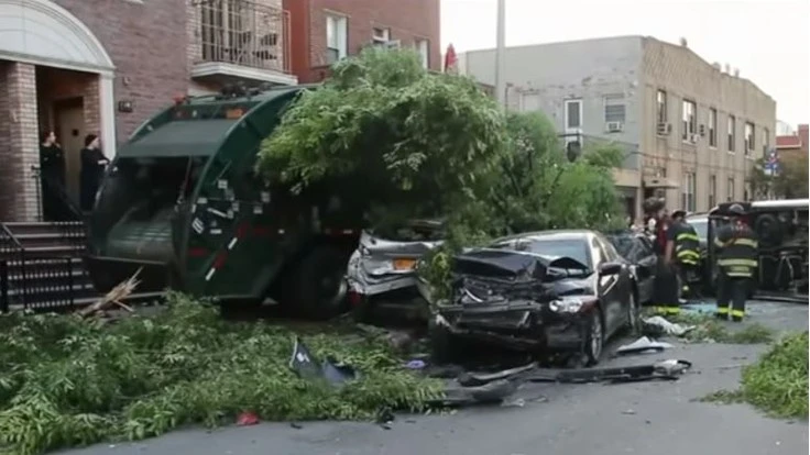 A drunk waste collection driver working in Brooklyn, New York, plowed into nine cars, a tree and demolished a home’s front porch in an attempt to evade police the morning of June 9, ABC News reports.