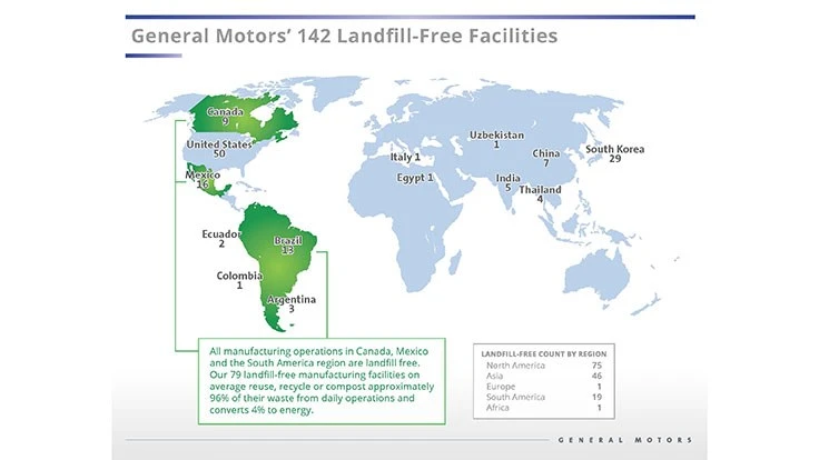 Automaker General Motors (GM), Detroit, has announced that an additional 27 GM facilities have reached zero waste status, bringing the total number of GM facilities achieving landfill-free status to 142. Further, the automaker indicates that all its manufacturing plants in Canada, Mexico and South America now recycle, reuse or convert to energy all waste from daily operations.