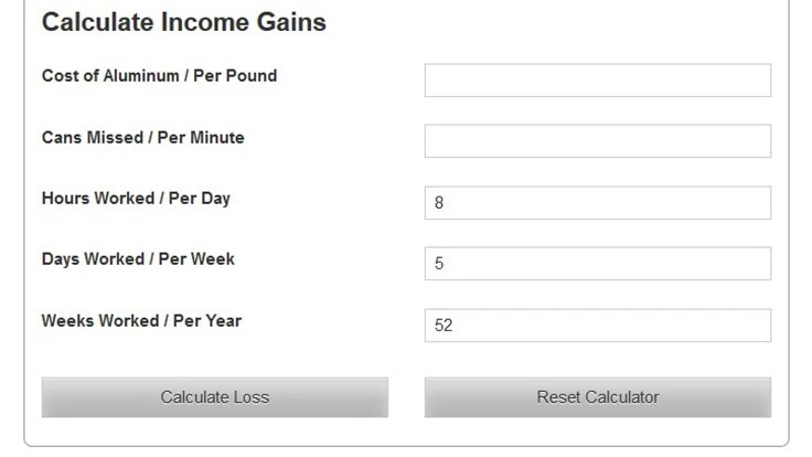 The tool calculates income gains after users input information related to cost of aluminum per pound, cans missed per minute, hours worked per day, days worked per week and weeks worked per year. It can be accessed by clicking here.