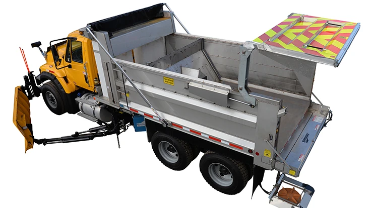 The HE features the J&J DynaControl hydraulic system with AutoFeed, a hydraulic double-acting high lift gate tailgate and the J&J AWARE camera system. AutoFeed automatically moves the load forward when the spreader is low on material, allowing the operator to focus on plowing. The double acting tailgate allows for simple removal of frozen chunks of anti-skid in snow and ice applications. The J&J AWARE camera system allows operators to see the position and operation of the ejector inside the body and visibility behind the truck when operating in reverse.