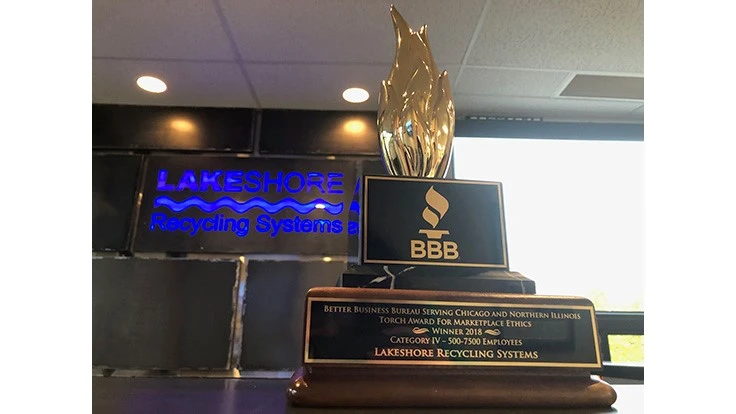 Lakeshore Recycling Systems (LRS), an independent recycling and waste diversion provider based in West Chicago, Illinois, has received a Better Business Bureau 2018 Torch Award for Marketplace Ethics for companies with 500 to 7,500 employees. LRS is the first waste services company to be recognized in the award’s 21-year existence.