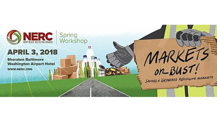 The Northeast Recycling Council (NERC), Brattleboro, Vermont, has announced details for its Spring Workshop—Markets or Bust—set for April 3, 2018, at the Sheraton Baltimore Washington Airport Hotel in Maryland. The event will focus on recycling market issues and market development opportunities.