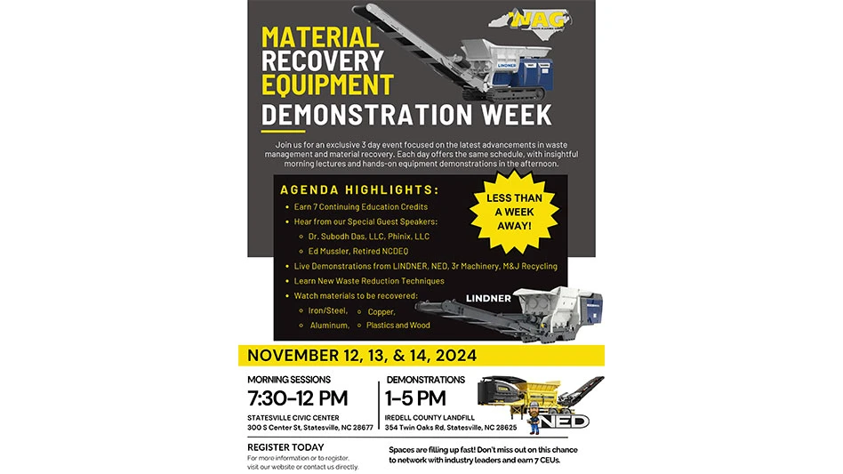 The Waste Alliance Group (WAG) of North Carolina will host Material Recovery Equipment Demonstration Week Nov. 12-14, with morning sessions at Statesville Civic Center, 300 S. Center St., Statesville, North Carolina, from 7:30 a.m. to noon, followed by equipment demonstrations from 1-5 p.m. at the Iredell Landfill, 354 Twin Oaks Rd. in Statesville.