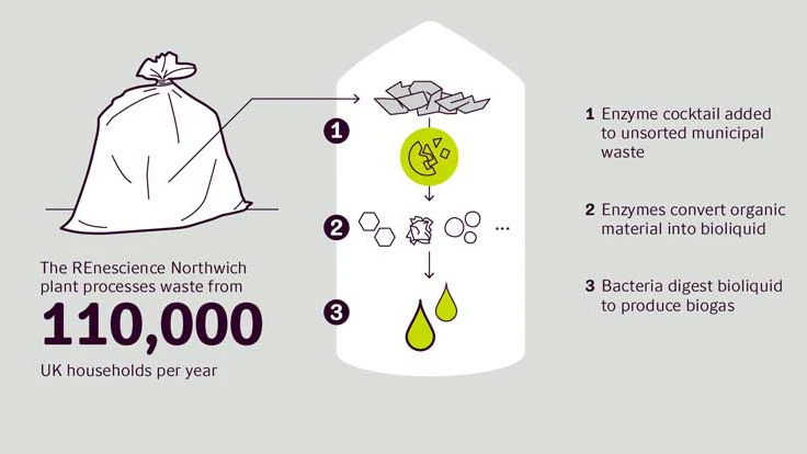 With the REnescience technology, ordinary unsorted household waste is mixed with water and enzymes in a large reactor. Then, the actual chemical process starts, and the enzymes dissolve all food waste, labels and similar types of organic waste and turns it into a liquid that can be used for biogas. At the Northwich facility, the biogas will be used to generate around 5 megawatts of electricity, which is enough to power around 9,500 typical households. The remaining part of the waste is plastic and metal, which can be recycled, and then there is a part that is converted into fuel.