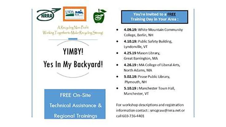 Funded in part by the U.S. Department of Agriculture (USDA) YIMBY! Yes In My Backyard! grant, the Northeast Resource Recovery Association (NRRA) is offering free training in Vermont, New Hampshire and Massachusetts over the next two months.