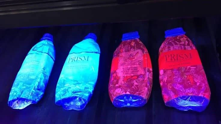 As the mixed plastics run along a conveyor belt, the high-speed sorting system is illuminated by an ultraviolet (UV) light source that identifies and reads the coded PRISM label. Jets of air propel the plastic containers into the appropriate recycling category.
