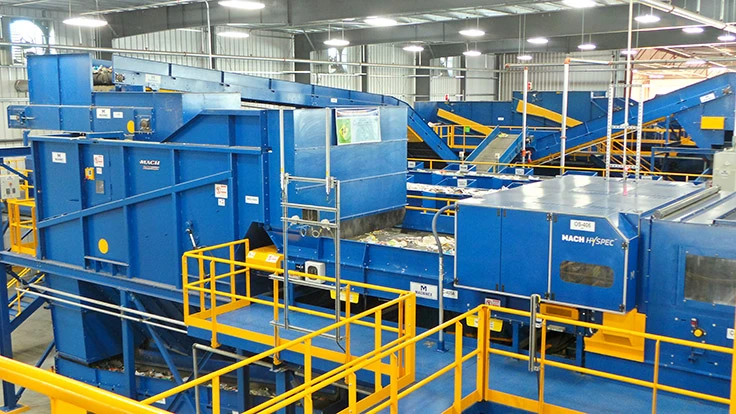 The advanced facility includes a shredder, a heavy-light separator, three ferrous magnets, two nonferrous separators, a drum feeder, a back-scraping drum and a truck loading station. The system also is equipped with Machinex’s latest technologies, including a MACH Ballistic Separator and three MACH HyspecTM optical units to sort PET (polyethylene terephthalate), HDPE (high-density polyethylene), fiber and aseptic packaging.