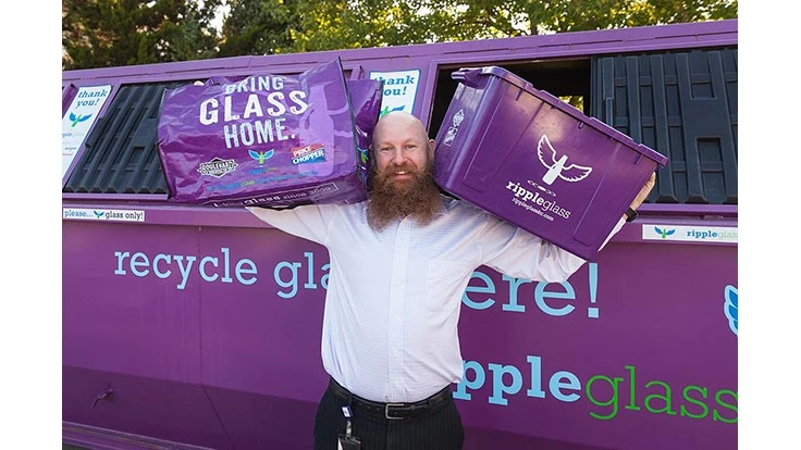 Ripple has grown from collecting 9,000 tons of glass per year from a few Missouri towns to collecting glass from more than 100 communities within a “nine-state range,” including Nebraska, South Dakota and Oklahoma. Ripple services the multiple states through its “small network of haulers,” Goth says, which keeps transport costs low for municipal and commercial partners.