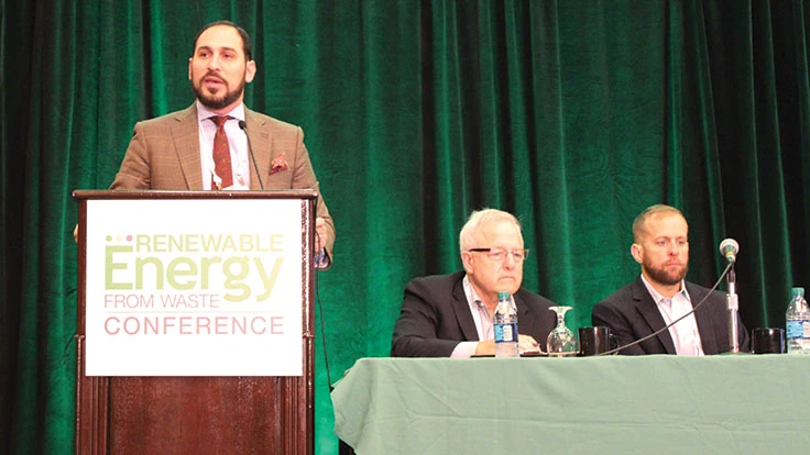 Johannes Escudero, Coalition for Renewable Natural Gas Inc., provides an update on the renewable natural gas market during the 2016 REW Conference. Seated are Harvey Gershman, Gershman, Brickner & Bratton, left, and Ted Michaels, Energy Recovery Council.