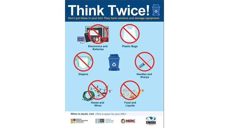 In an effort to help consumers recycle properly, the National Waste and Recycling Association (NWRA), the Solid Waste Association of North America (SWANA), the Northeast Recycling Council (NERC) and the Institute of Scrap Recycling Industries (ISRI) have jointly developed the Think Twice poster.