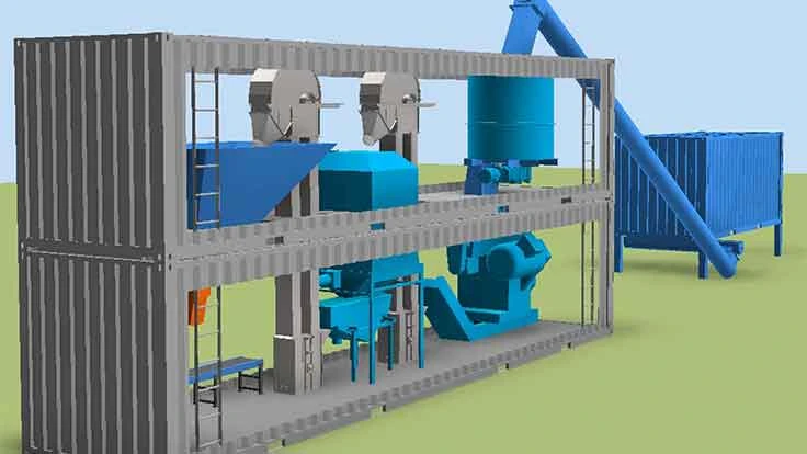 A turnkey pellet production plant housed in standard shipping containers, the CPP is designed, built and shipped from Vecoplan Midwest's New Albany, Indiana, location. It comes complete with controls, and arrives on two semi trucks.