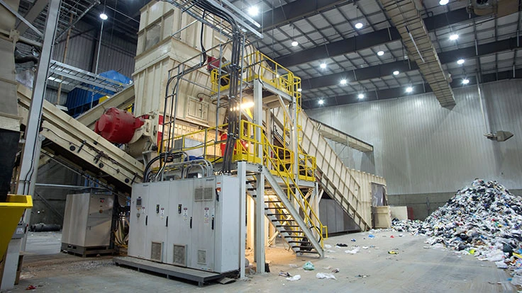 Materials are received on the tipping floor of the feedstock preparation facility, which includes a load enclosure and steel belt conveyor. A Hurricane VVZ310 T dual-shaft shredder performs a preshred of the materials. Waste screens filter out minus-1-inch materials. Overbelt magnets remove ferrous metals, while eddy current separators remove nonferrous metals. Wind sifters remove heavy materials, such as rocks and glass. VIC (Vecoplan Integrated Controls) automated control system that integrates controls for the entire RDF processing plant.